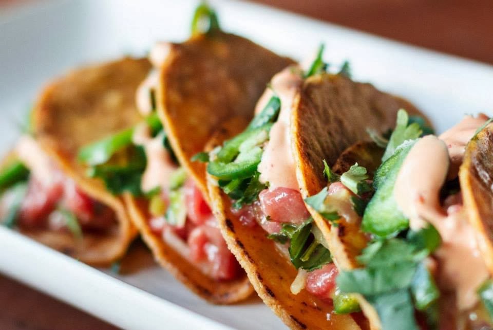 Mini Steak Tartare ‘Tacos’ – New York Steak, Serrano, Radish, Red Onion, Egg Yolk, Dijon Mustard, Lime, Cilantro and Chipotle Aïoli served in Mini Crunchy Taco Shells