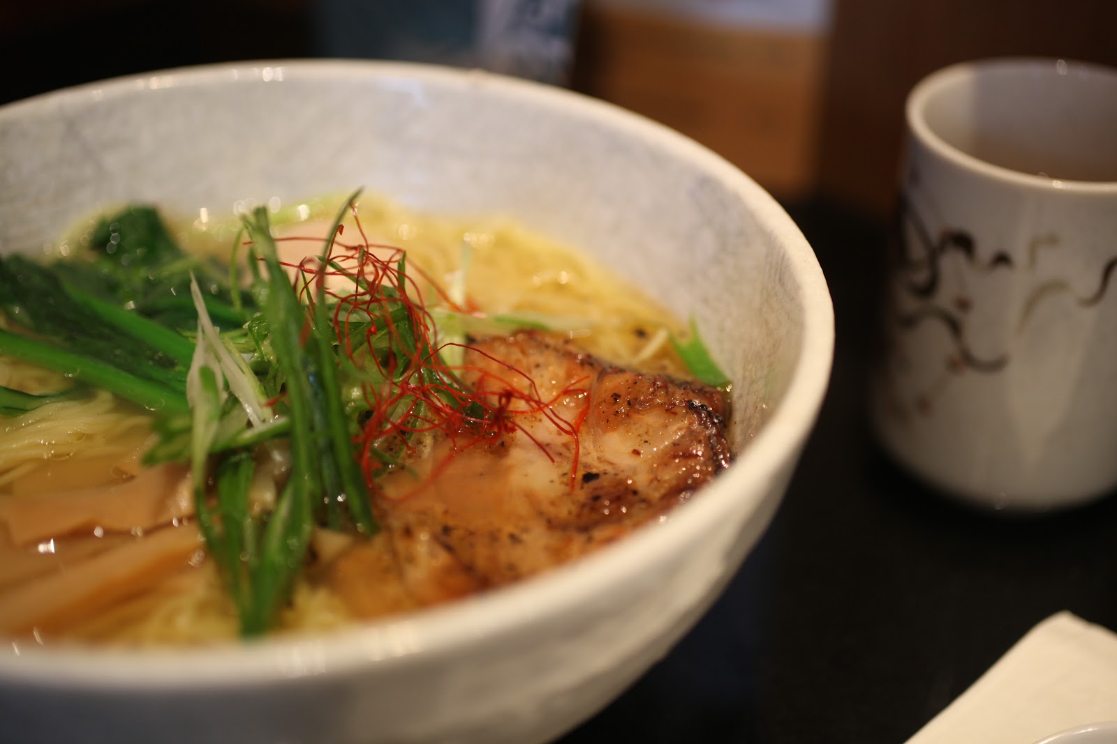 Menu: Rich pork broth flavored with Yamaguchi soy sauce and topped with burnt garlic oil.